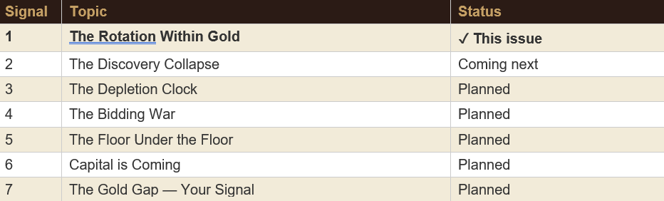 Signal 6: Capital is Coming. The capital starvation paradox — money is flooding into gold equities, but it hasn’t reached the sub-$200M tier yet. When it does, the denominators are tiny.