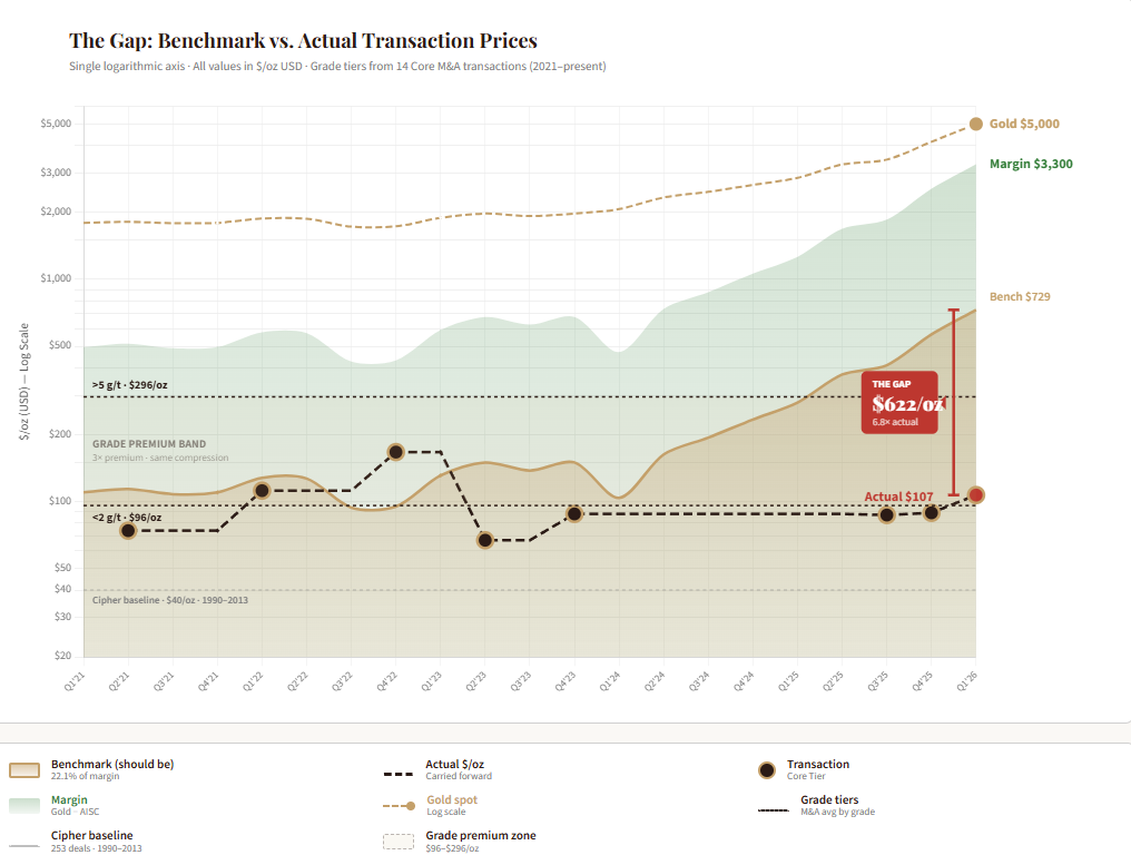 Force 3: The Gold Gap compression becomes unsustainable. This is the quantitative bridge between the macro and the micro. Across 11 core M&A transactions involving pre-production gold assets in Tier-1 jurisdictions since 2021, the median price paid per ounce of gold in the ground is US$93 (the Core Median from the Gilbert Analytics M&A database). The benchmark — 22.1% of current operating margin ($5,000 minus $1,700 AISC = $3,300 × 0.221) — implies a margin-justified value of $729/oz. That is 87.2% compression.
