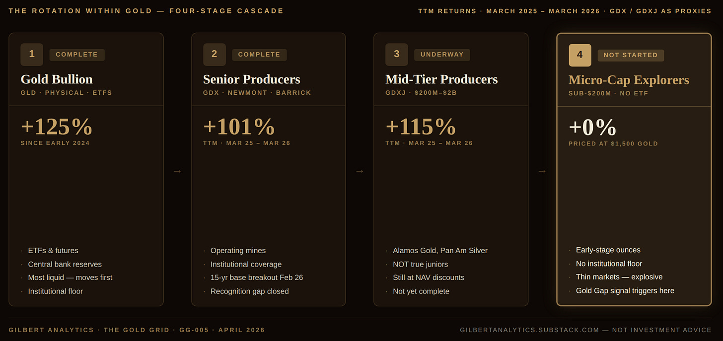 Stage 4: Micro-cap explorers. Sub-$200 million. Often sub-$50 million. These are the companies below the GDXJ floor — the ones that hold early-stage ounces in Tier-1 jurisdictions but lack the market cap, liquidity, or institutional coverage to participate in the first three stages of the cascade. They are priced as though gold is still at $1,500. This stage has not started.